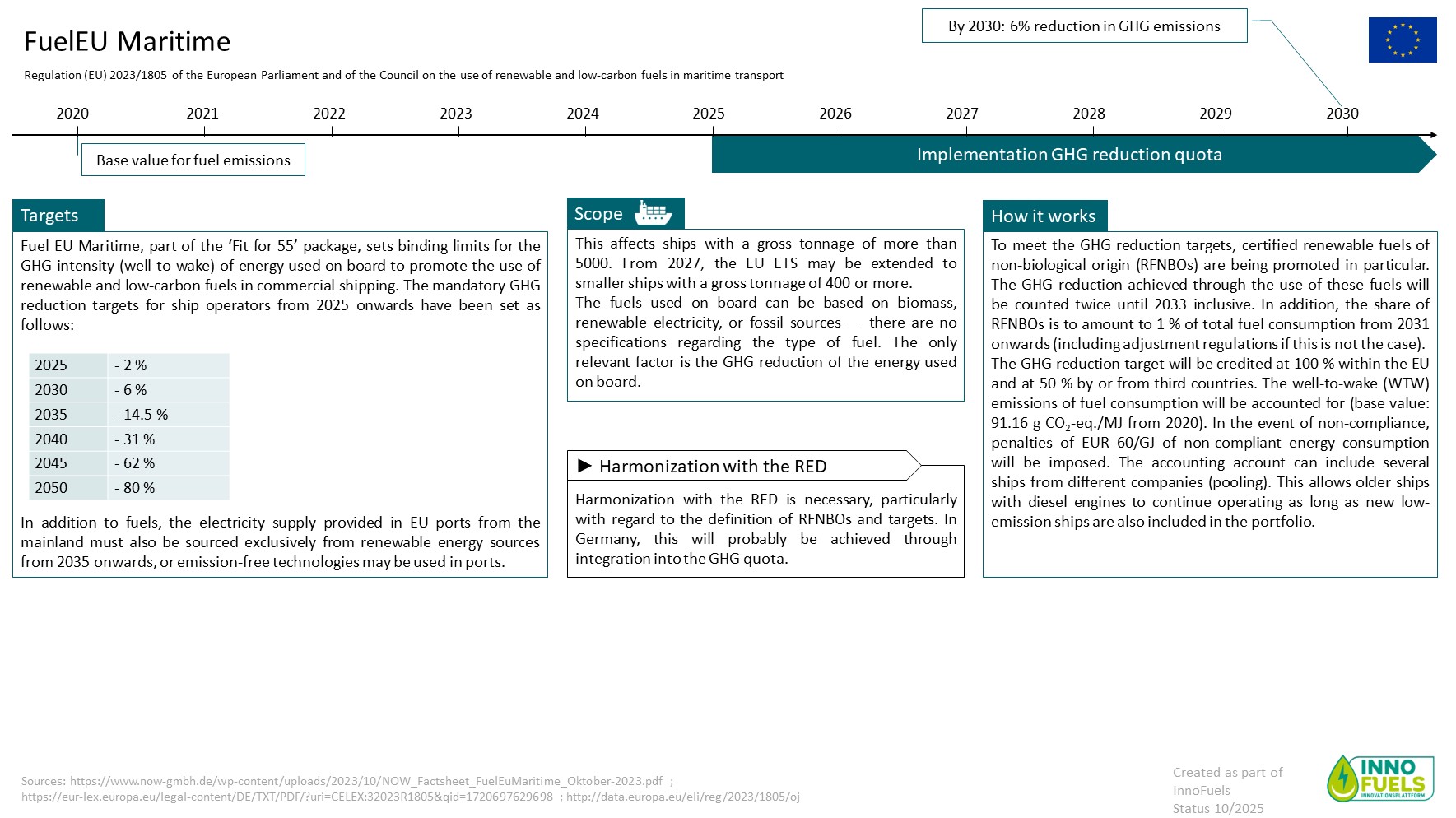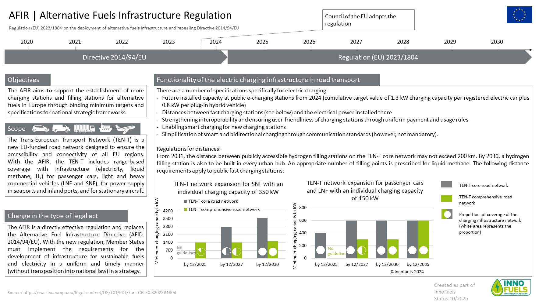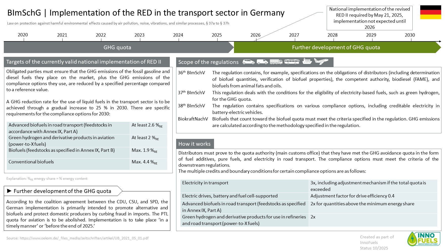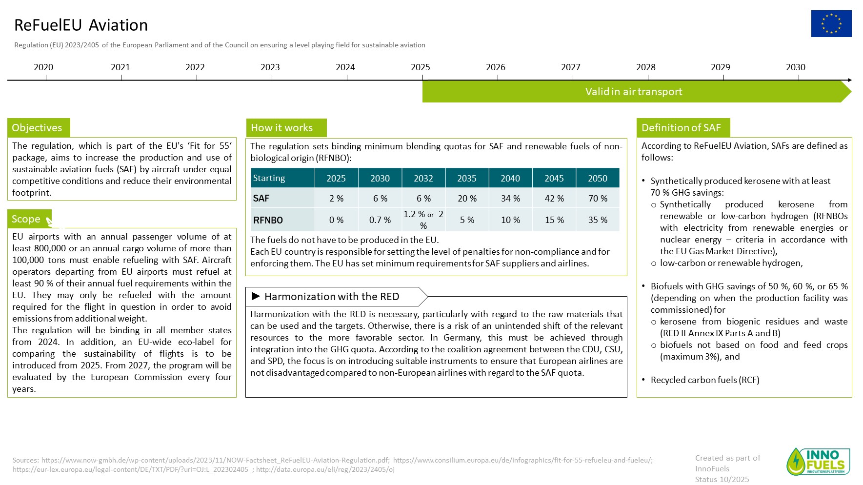 The overview created as part of the InnoFuels project provides a compact overview of the current legal situation in the transport sector and summarizes the most important regulations on objectives, mode of action and scope, with regular updates planned until the end of the project. You can view and download the overview either as a complete package or individually for each of the regulations listed here.