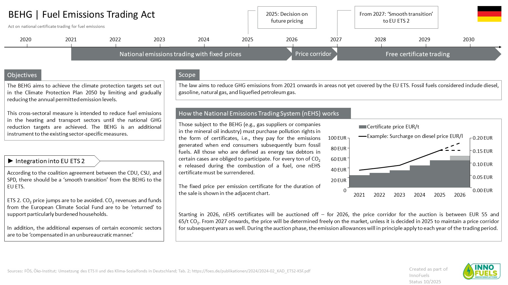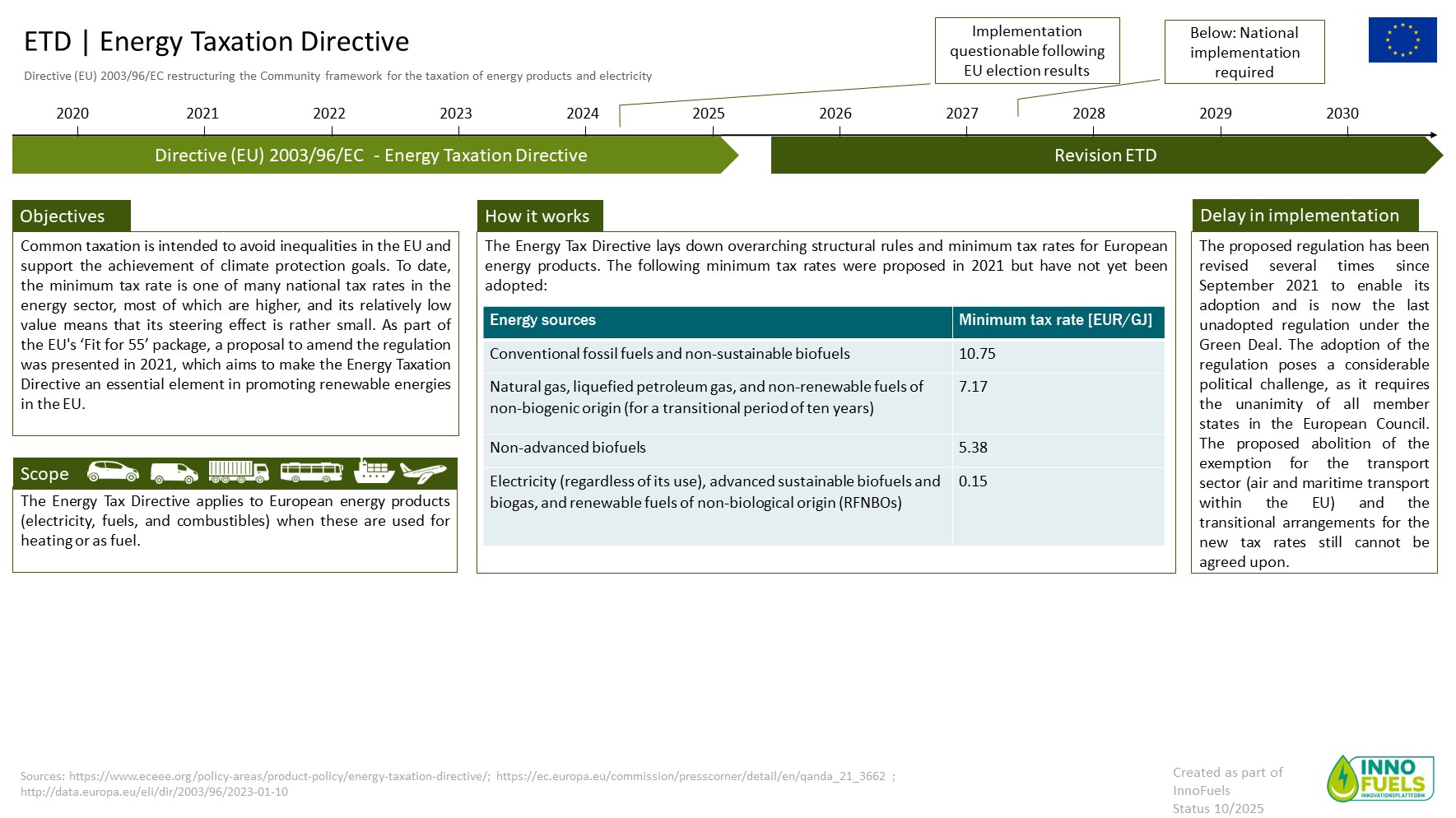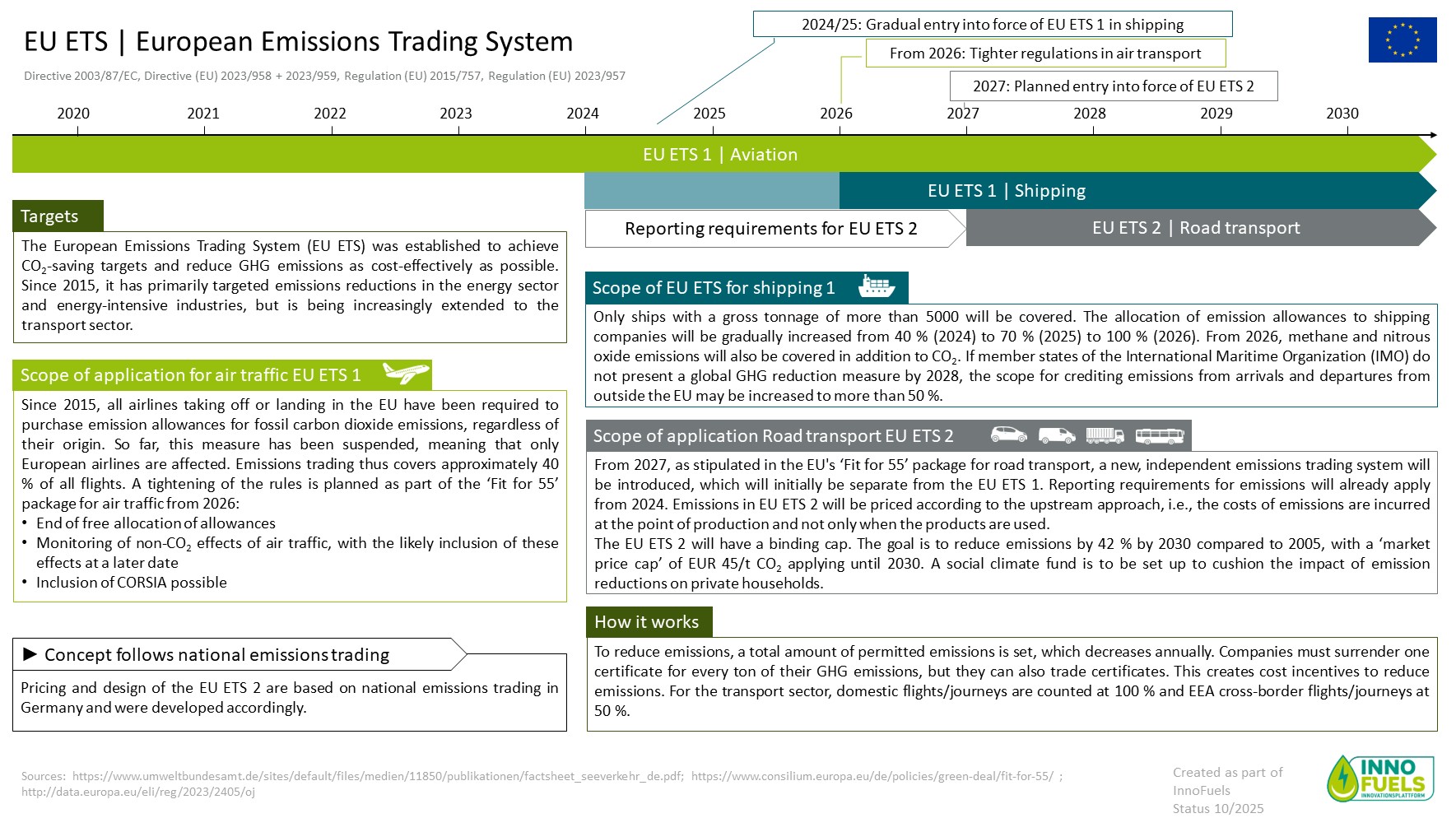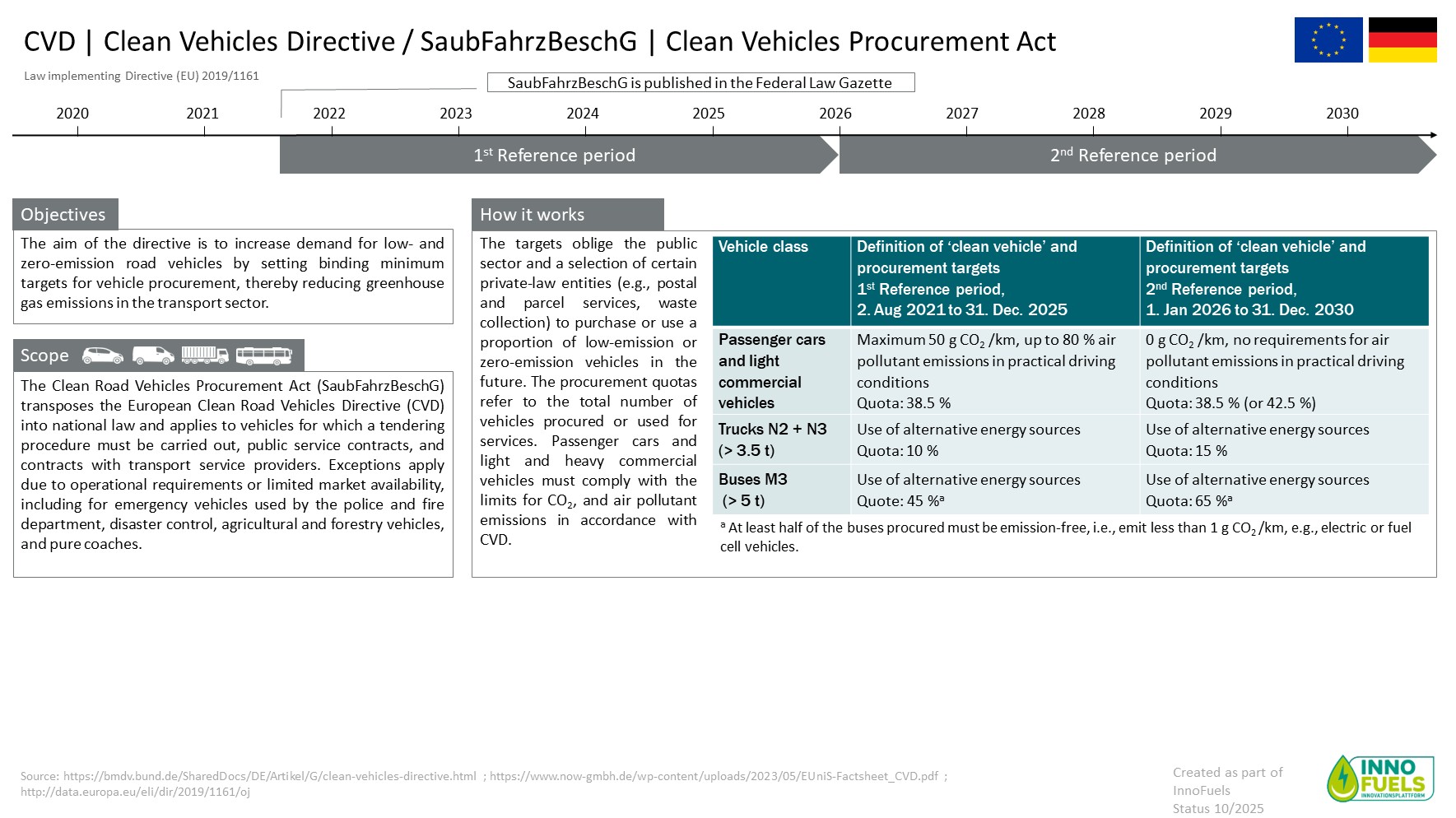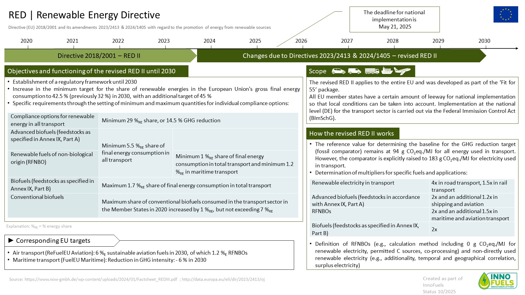 The overview created as part of the InnoFuels project provides a compact overview of the current legal situation in the transport sector and summarizes the most important regulations on objectives, mode of action and scope, with regular updates planned until the end of the project. You can view and download the overview either as a complete package or individually for each of the regulations listed here.