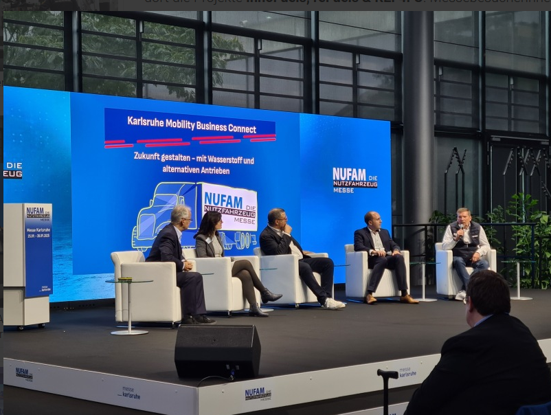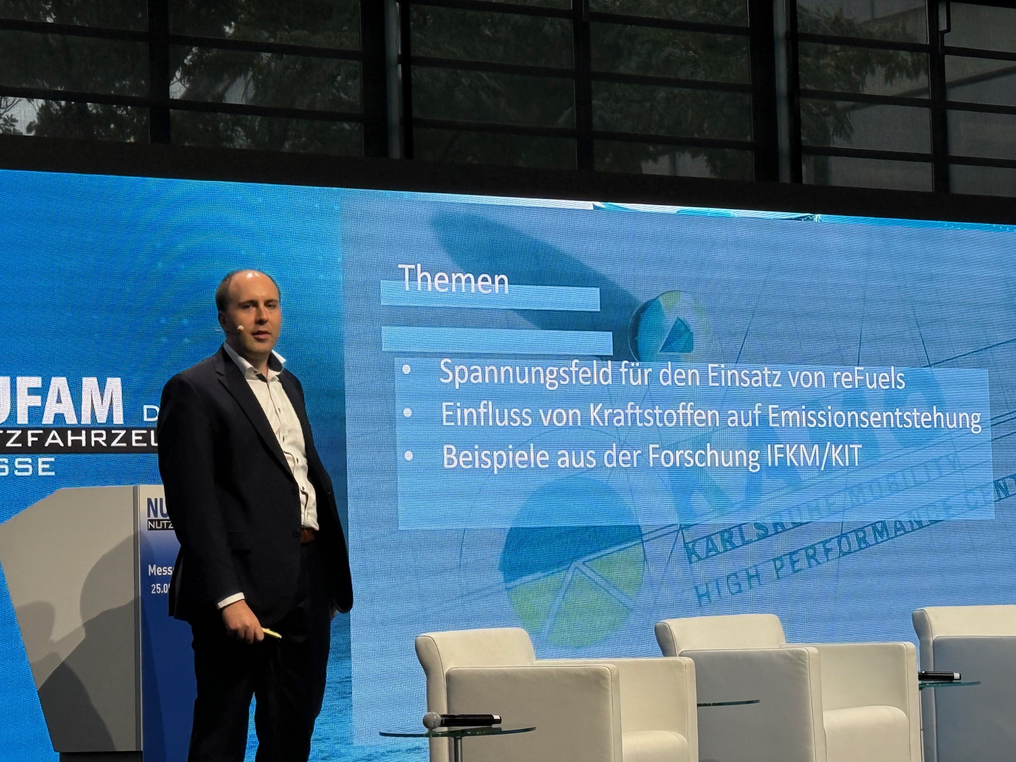 From September 25 to 28, the KIT/IFKM presented itself at the NUFAM commercial vehicle trade fair in Karlsruhe with the InnoFuels, reFuels and REF4FU projects. Visitors to the stand were given insights into research, networking and the ramp-up of renewable fuels. In the specialist program "Deep Dive", Alexander Heinz (KIT/IFKM) presented results on harmful gas emissions from reFuels, while InnoFuels project coordinator Dr. Olaf Toedter (KIT/IFKM) chaired the panel discussion.